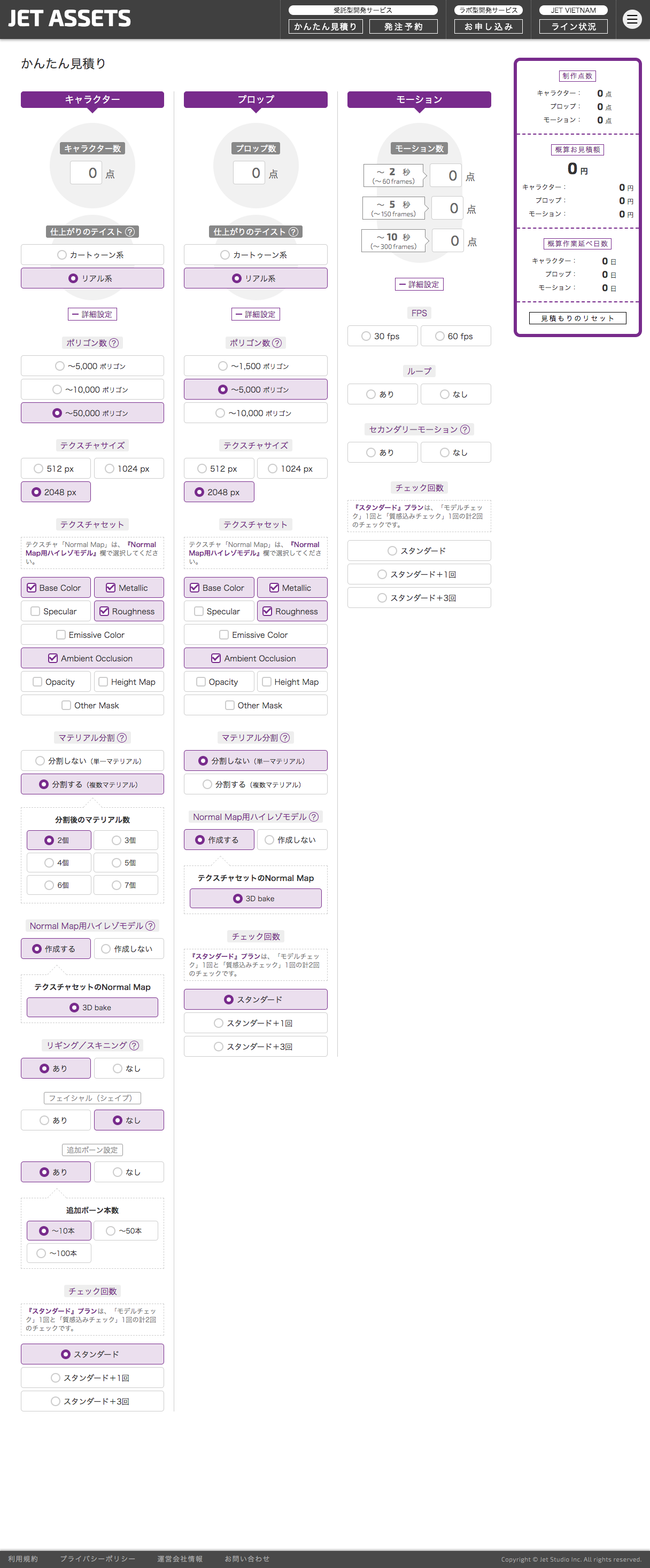 リアルタイムアセットの発注/管理をオンライン上で行えます。発注画面では、選択肢を選ぶだけで大まかな仕様が決められ、LODやリギングなどの詳細な設定も行えるようになっております。また、過去の注文履歴や現在進行中のアセット一覧などをどこからでもご確認いただけます。