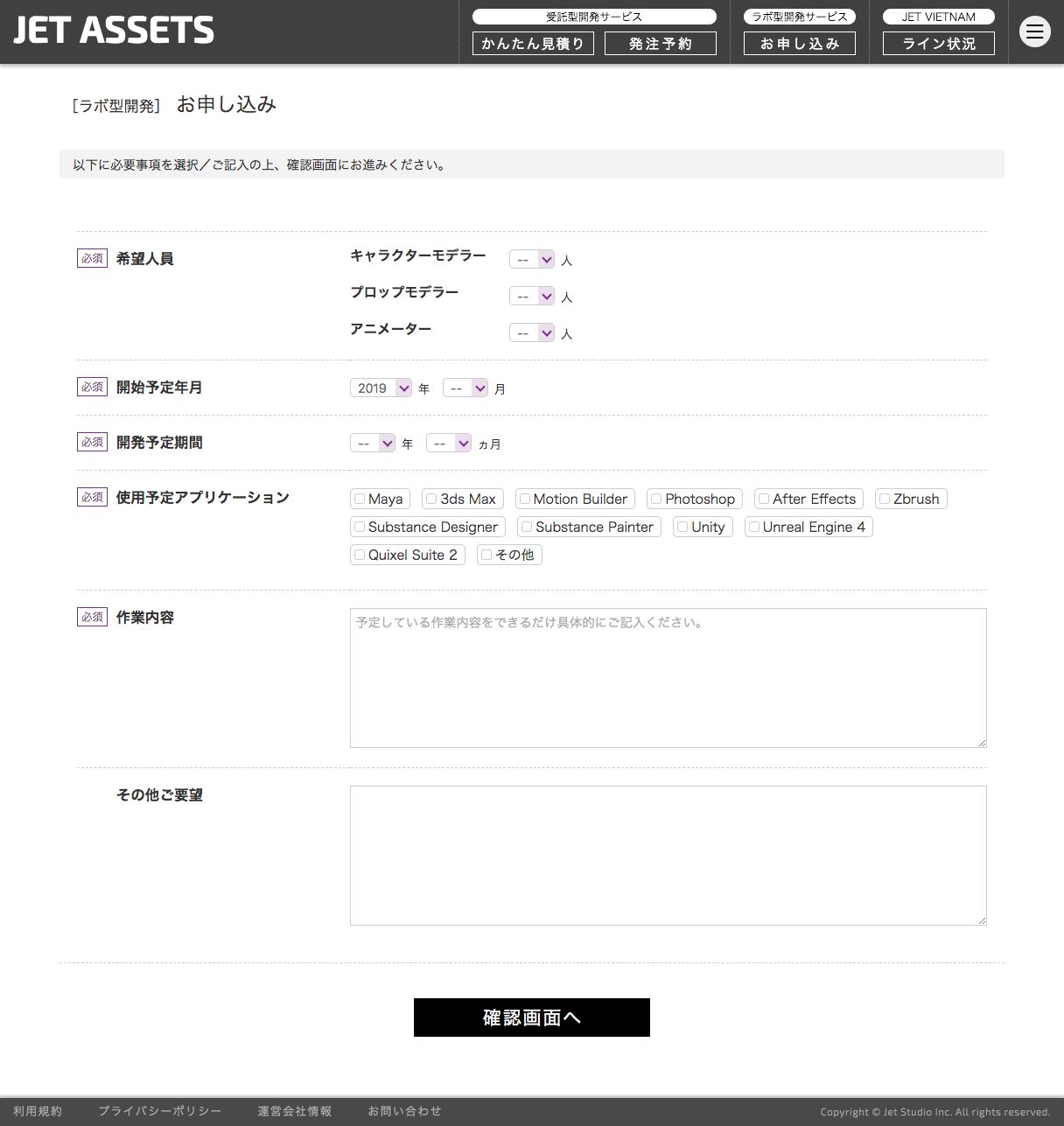 ラボ型開発サービスは、会員様専属のリアルタイムアセット制作チームをJET STUDIO VIETNAM(ベトナム・ホーチミン市)内に持っていただくサービスです。専属の日本人ブリッジPM(プロジェクト・マネージャー)が現地の制作チームを管理しますので、指示や報告は全て日本語で対応させていただきます。